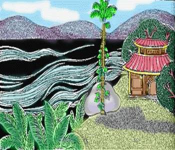 Người vợ ở nhà, thấy chồng không về, liền chạy đi t́m. Nàng cũng lại tới bờ sông th́ được biết là em và chồng đă chết. Nàng thương xót, khóc lóc, ôm tảng đá vôi mà chết theo. Thế rồi thi hài nàng hóa thành dây trầu leo quanh tảng đá vôi.